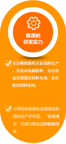 焦作美博士飼料有限責(zé)任公司是一家現(xiàn)代民營(yíng)有限責(zé)任公司,位于知名的鵪鶉養(yǎng)殖基地—河南省焦作市武陟縣。公司自成立于2005年,占地15畝,自成立以來(lái)一直聚焦鵪鶉營(yíng)養(yǎng)研究,專(zhuān)注鵪鶉飼料研發(fā)生產(chǎn),致力帶動(dòng)鵪鶉產(chǎn)業(yè)發(fā)展。 企業(yè)榮譽(yù) 1、2018年以焦作美博士飼料公司為依托成立了市級(jí)鵪鶉飼料工程技術(shù)中心---焦作市鵪鶉飼料工程技術(shù)中心?! ?、2019入庫(kù)國(guó)家級(jí)......